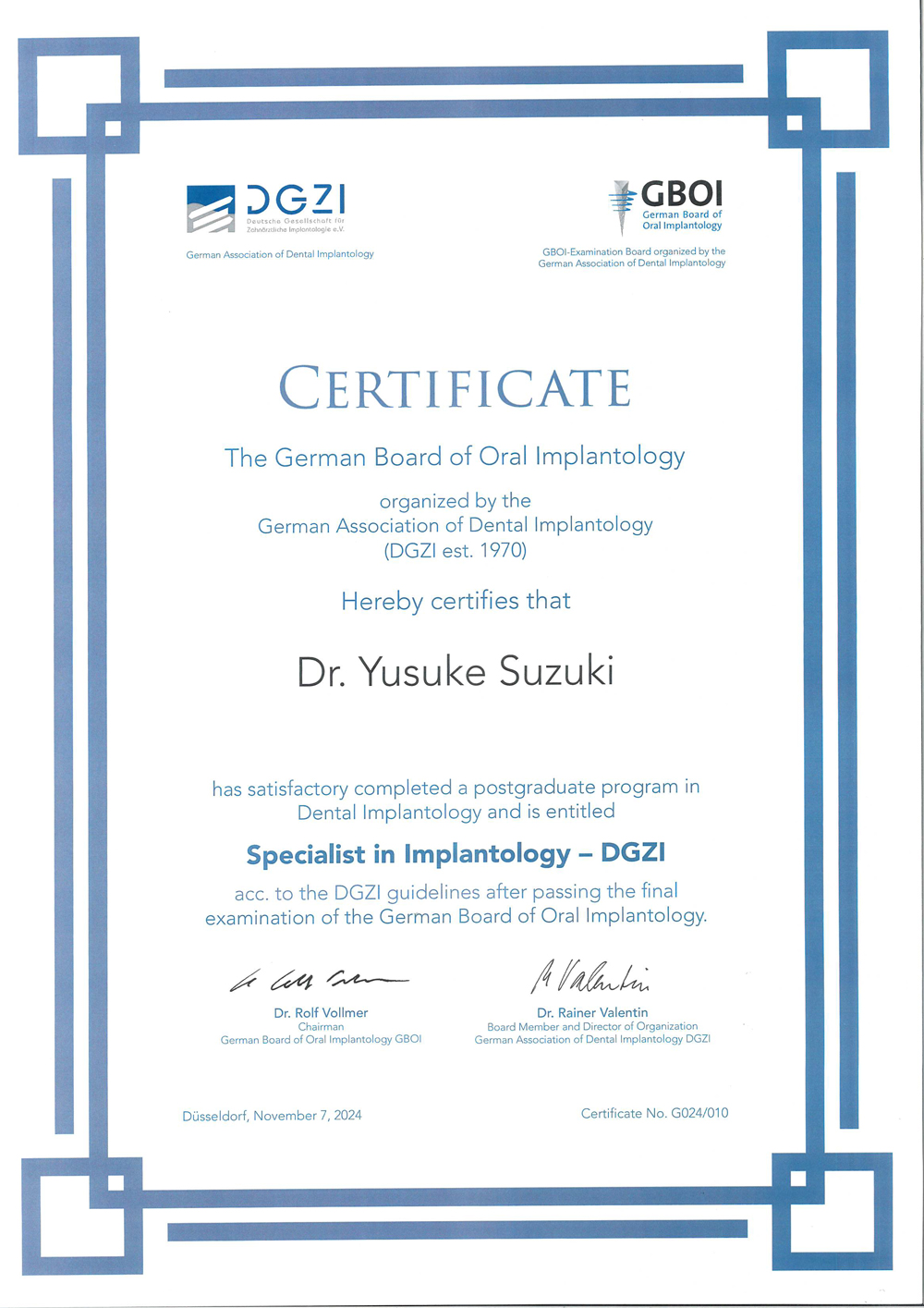 ドイツ口腔インプラント学会(DGZI)のスペシャリスト資格(国際指導医)は、インプラント治療における高度な技術と知識を持つ証明であり、患者さまに安心と信頼を提供します。この資格を持つ歯科医師は、厳しいトレーニングと試験を経て最先端の治療法を習得し、安全で質の高い治療を提供します。