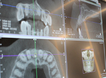歯科用CTは歯の形や状態だけでなく、顎骨の量や高さ、さらには血管の位置も判明します。歯科用CTで得た情報をコンピューターで解析し、インプラント体を埋める位置や方向を決めていきます。人間の勘ではなく、論理に基づいたシミュレーションによってより安全なインプラント治療が可能になります。